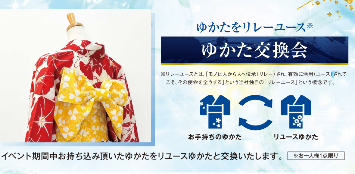 イベント期間中、お手持ちのゆかたをお持ち込みいただくと、リユースゆかたと交換ができます。